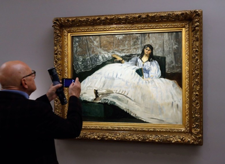 When Édouard Manet painted Jeanne Duval, her vision was failing. It was near the end of her life, and she needed assistance walking. Syphilis was killing her. Manet captured her in a bed overwhelmed by a dress so fluffy and white she seemed to be swallowed by it. The 1862 title of the painting followed suit: “Baudelaire’s Mistress.” (Now it is called “Woman with a Fan.”) She was described as only an appendage to the Frenchman. Duval had been described in the writer’s work frequently. She and Baudelaire were long-term lovers, though she remained an exotic to his pen and mind. He referred to her home, Haiti, as a “hot blue land.” And in one of his poetic dedications to her he wrote “Blue-black hair, pavilion hung with shadows / You give back to me the blue of the vast round sky; / In the downy edges of your curling tresses / I ardently get drunk with the mingled odors / Of oil of coconut, of musk and tar.” The implied blue-blackness under her skin — the Haiti, the Africa, within a woman who, based on Manet’s painting, we know was light-skinned enough to be blue-veined — was titillation for Baudelaire and his readers. In the painting, the shadows of her dress and fan are blue; her hair and eyes, black.