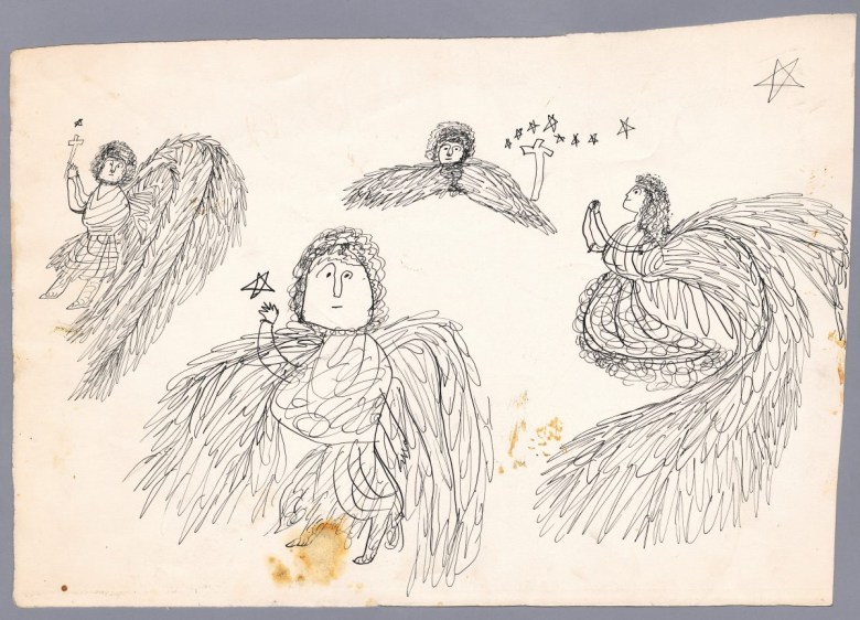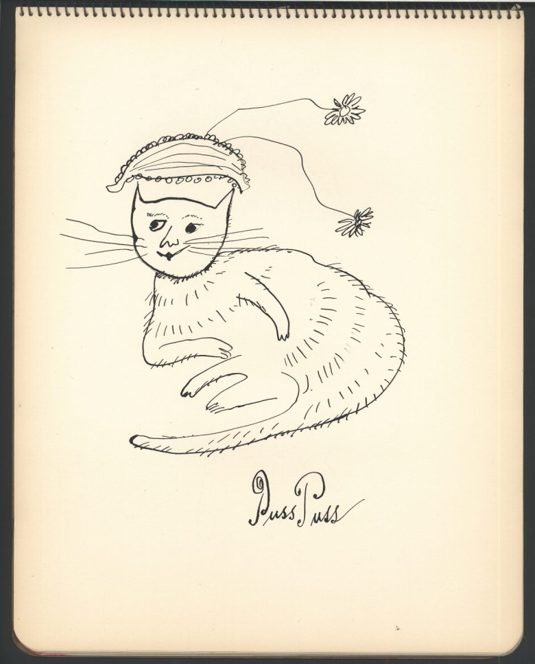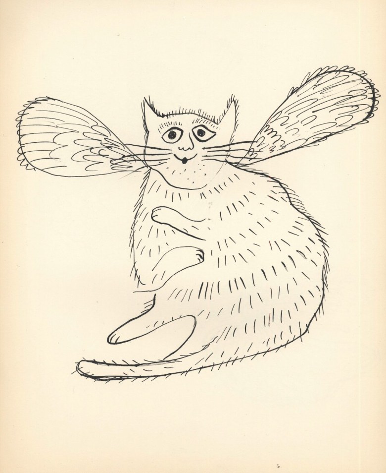 Classism often obscures the fertile proletariat soil from which much American modernist art grew, but studies such as Rusinko’s remind us of the ethnic and working-class origins of those artists. For Julia Warhola was not just a passive actress in Andy’s films, but the calligrapher and co-illustrator for books like the charming 25 Cats Named Sam and One Blue Pussy and Holy Cats (1954), which combined her love of angels and felines. As a solo artist, she won a Certificate of Merit from the American Institute for Graphic Arts in recognition of the 1957 album cover design for the seminal experimental record The Story of Moondog. And yet the attribution of these collaborative works? “Andy Warhol’s mother.” Rusinko’s book reminds us that she, Julia, was much more than that.