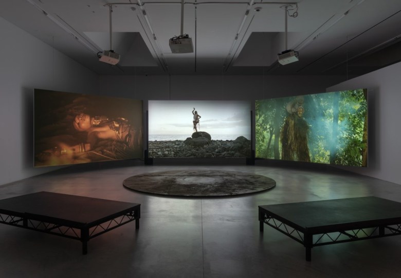 While “VOID” created a space to look inward, Serafin sought to open an invitation to a collective of trans people with the other iterations. The three-channel video “Creation Paradigm” (2023) straddles inward and outward manifestations of spirit work. In devising the piece, Serafin asked performers Bunny Cadag, Lukresia Quismundo, and Alaga to envision their embodiment as a divine entity. Within a crescendo of elemental rituals, the video locates possibilities of trans joy not only in an optimistic future, but also in pre-colonial pasts where trans and nonbinary people were celebrated as channels of divinity.