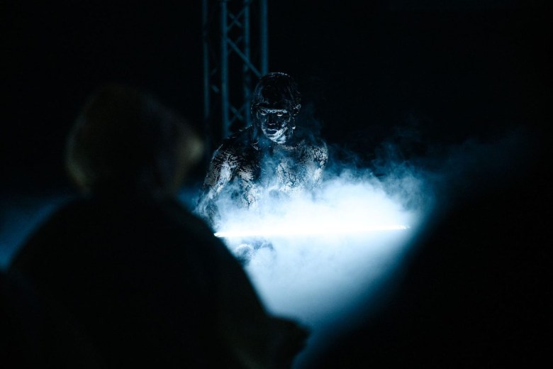 With the protection of spirit guides that they seem to call on through an array of nude withering gestures, their shadow is invited to come out of the darkness and claim center stage as they plunge into a pool of black slime. The visual language, Serafin expanded, further draws from the hedonistic energy of “darkrooms, club floors, the carnality that we lean into to deal with the pressure of queer life.”