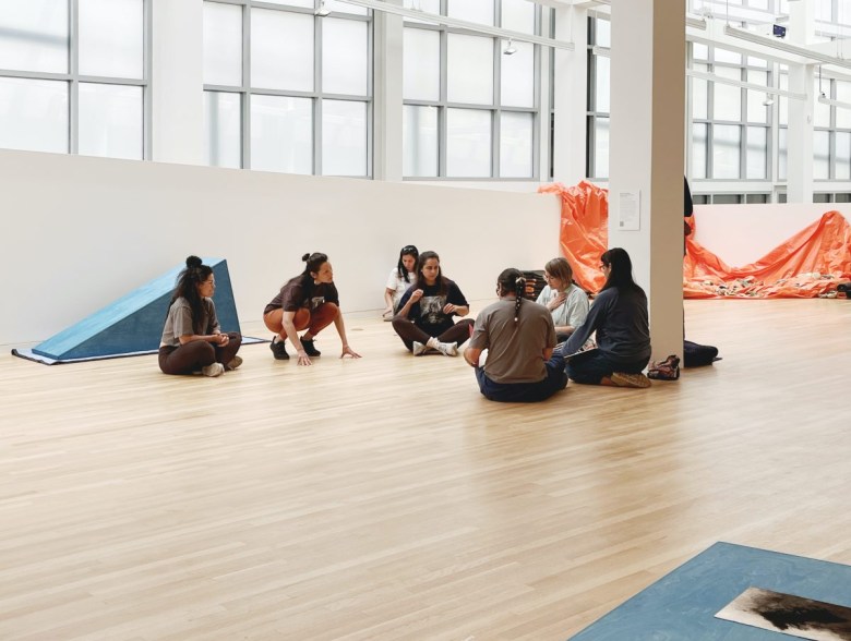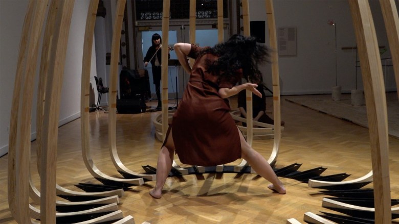 “An open space of contemplation.” That is how Alutiiq/Sugpiaq multidisciplinary artist and choreographer Tanya Lukin Linklater described her embrace of dance during a recent phone interview with Hyperallergic. Speaking from the Wex, where she was installing her solo exhibition Inner blades of grass (soft) inner blades of grass (cured) inner blades of grass (bruised by the weather), which recently closed on August 21, the artist shared that she is drawn to the medium because it “didn’t feel overly determined.” Rather, it maintains a porousness, a sense of potential and freedom, that she very much welcomes. Her show shares over a decade of her practice, communicating Indigenous movement systems and forms of knowledge through dance and open rehearsals, sculpture and installation, video, works on paper, and writing.