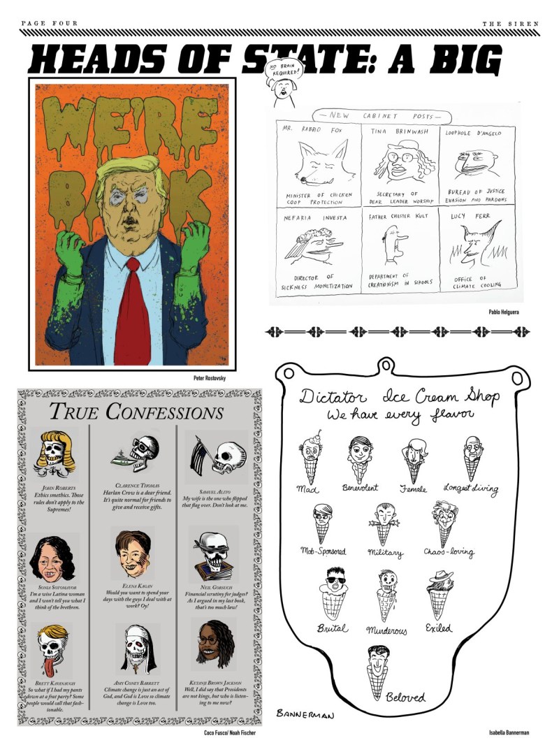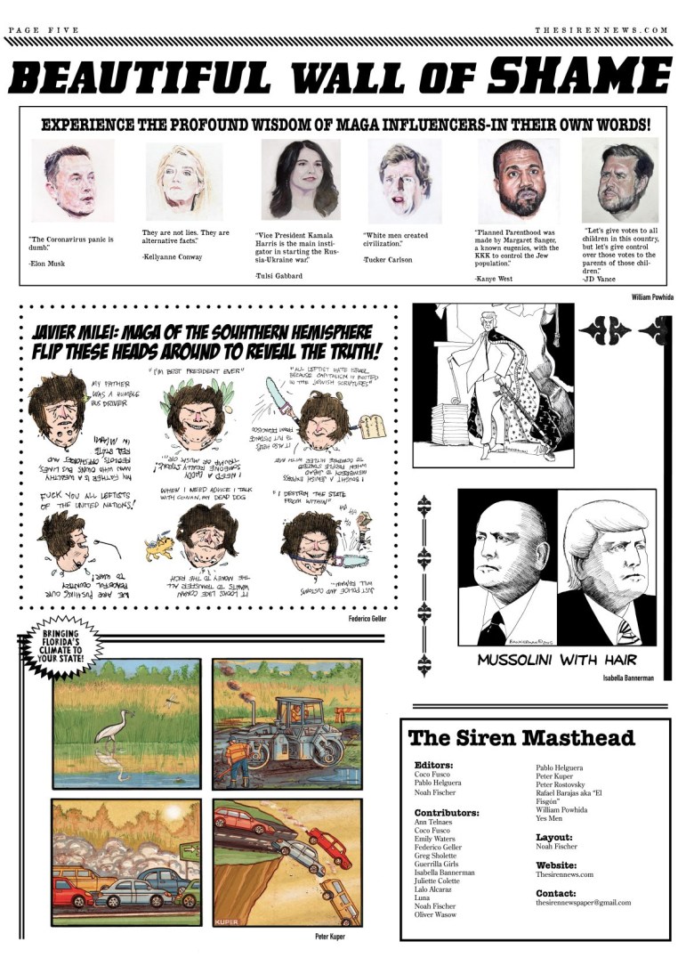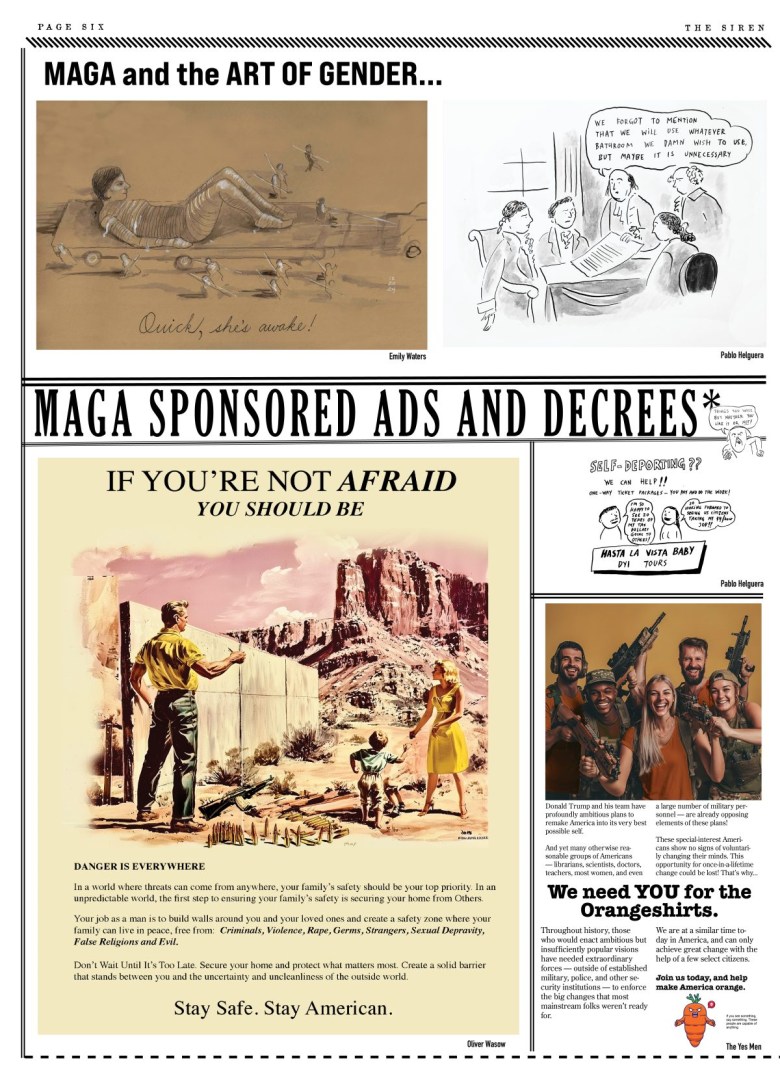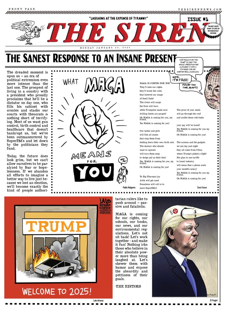 In the days after the 2024 election, I got my fill of mea culpas from disheartened Democrats and fatalistic “what else can we expect from politics?” dismissals from people around me. Shortly thereafter, I visited the Mexican Prints at the Vanguard exhibition at the Metropolitan Museum of Art and was deeply moved by the ingenuity and vitality of the cartoons and posters. I recall my sense of awe at the brilliant satirical depictions of authoritarianism that José Guadalupe Posada created about the Porfirio Díaz dictatorship and my laughter at the rhymes lampooning the rich and powerful. Before I left, I started thinking to myself that I should try to do the same. So I contacted my colleagues Pablo Helguera and Noah Fischer and pitched the idea of a publication to them. Lucky for me, they immediately agreed. I’ve been amazed at the willingness of so many of our colleagues to share their work with us for the first issue of The Siren. Here is the sanest response we could come up with to our utterly insane times. May it sharpen our wits! —Coco Fusco