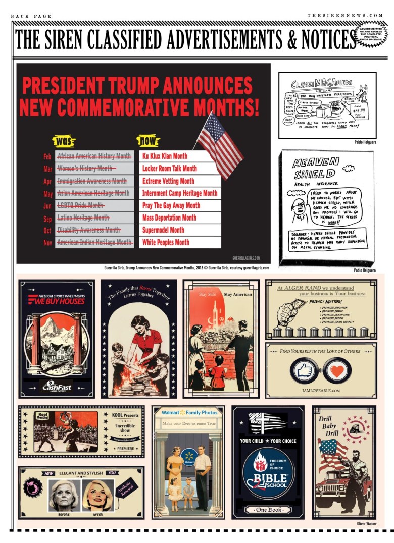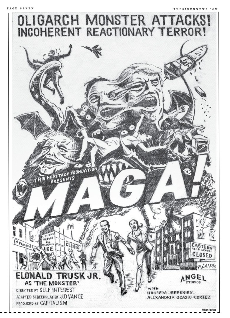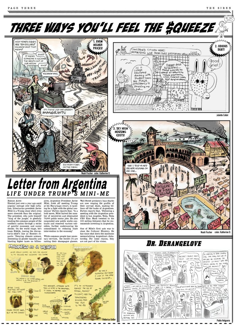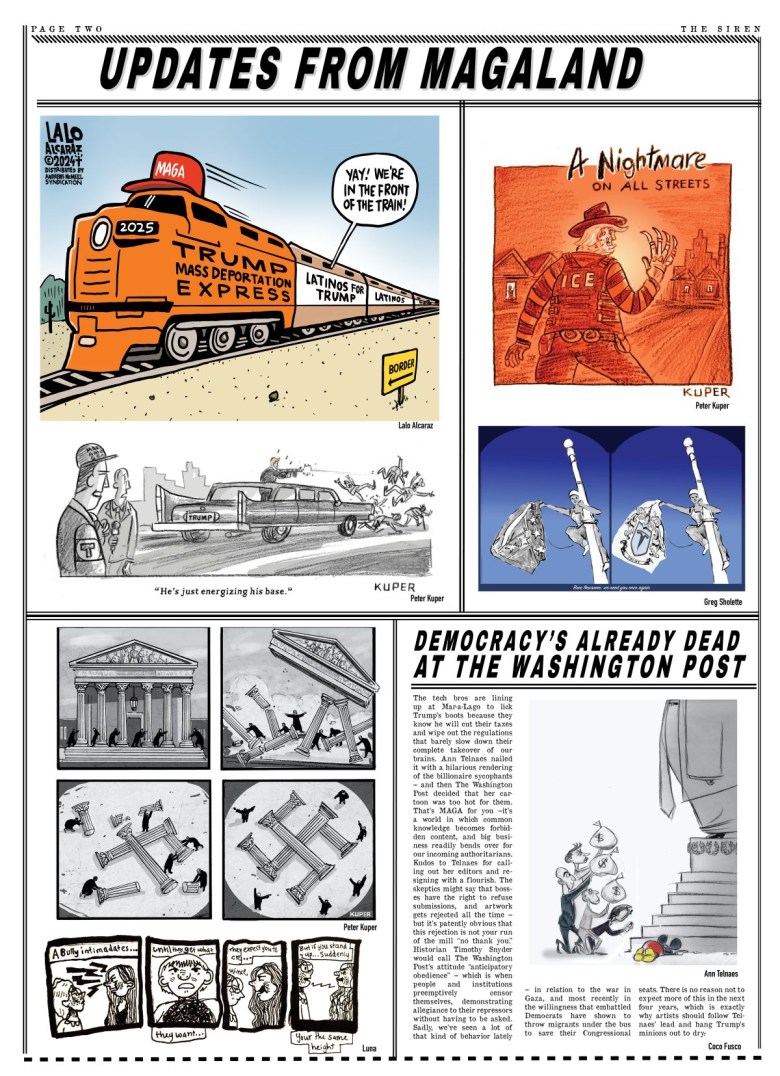 In the days after the 2024 election, I got my fill of mea culpas from disheartened Democrats and fatalistic “what else can we expect from politics?” dismissals from people around me. Shortly thereafter, I visited the Mexican Prints at the Vanguard exhibition at the Metropolitan Museum of Art and was deeply moved by the ingenuity and vitality of the cartoons and posters. I recall my sense of awe at the brilliant satirical depictions of authoritarianism that José Guadalupe Posada created about the Porfirio Díaz dictatorship and my laughter at the rhymes lampooning the rich and powerful. Before I left, I started thinking to myself that I should try to do the same. So I contacted my colleagues Pablo Helguera and Noah Fischer and pitched the idea of a publication to them. Lucky for me, they immediately agreed. I’ve been amazed at the willingness of so many of our colleagues to share their work with us for the first issue of The Siren. Here is the sanest response we could come up with to our utterly insane times. May it sharpen our wits! —Coco Fusco