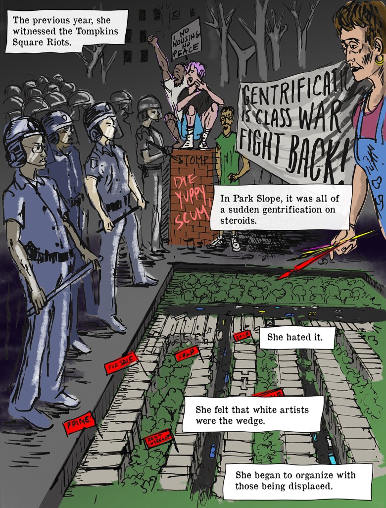 This is the third of a series of comics depicting transformative moments in the lives of artists, activists, and organizers on the front lines of the housing affordability crisis in New York City