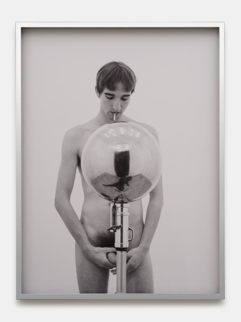 Communicative efficacy is also thrown into chaos elsewhere in the exhibition. In “Night Studio Mirror (_ DSF1073),” we see the artist holding a piece of cloth in front of his torso, documenting himself, his viewer, or an unknown third subject via a camera on a tripod. But a tilted mirror in the background beside him coyly reveals the artist’s naked buttock, opening up a new pictorial plane as well as a space of desire. The artist, trying to cover up his nakedness, is betrayed by the mirror — or perhaps it was all intentional. If eroticism is the desire for the unseen, then the camera at his hip, with its phallic rod and knob, stokes that desire. This game is reprised in works like “Gallery Gazing Ball (DSCF1919)” in which a beautiful young man (a collaborator? a lover?) looks disaffectedly downward, as if evading representation, in front of what appears to be a reflective sphere. Here, the phallic rod holding up that ball threatens to obfuscate his mostly revealed penis, again playing with the eroticism of the seen and unseen.