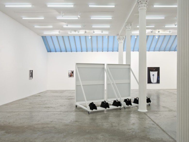 Two freestanding billboard structures, together entitled “Studio Mirror Diptych (_DSF3596, _DSF3598)” (all works 2024) dominate the entrance to the exhibition. But they face away from the viewer, denying easy access. A billboard is a public monument that traffics in commerce and consumption, therefore eliciting identification, yet here they are reoriented inward, suggesting introspection or intimacy. As we come around to the front, we see that these works capture the process of production: Older works are hung on walls beside studio equipment, acting as props. The artist himself is depicted but disembodied, split in half by the gap between the billboards with only the outer edges of his limbs visible. A mirror in the image confuses any deciphering of depth. It’s unclear what’s being documented by the artist’s camera, seen at the right edge of the leftward billboard — possibly us. The act of sitting for photography, traditionally a passive position, is here turned against itself: the positions of spectator and performer switch off, dissolving the fourth wall and complicating a linear sense of time in which a work is completed and then viewed.