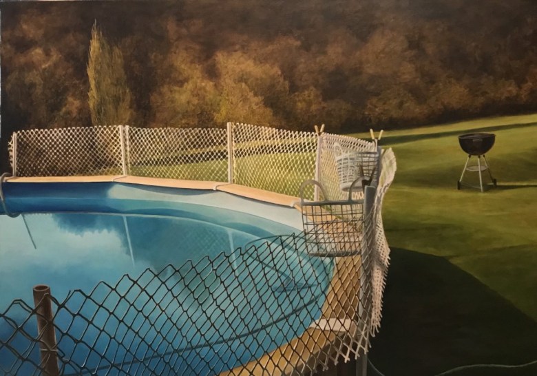 A series of sumptuous and moody oil paintings by Linda Griggs at the Front Room Gallery in Hudson reflects a feeling of solitude laced with a trace of strangeness. The story of the exhibition begins with works such as “Night Swimming” (2024) and “Sirens” (2023), in which aqua-tinted pools suggest midnight skinny dipping on sultry summer evenings. The ambiance lightens with works such as “Hamilton Fish Kiddie Pool” (2023), in which empty lifeguard chairs and recliners anticipate an influx of seasonal swimmers and sun worshippers. Griggs’s tale then takes a turn towards a hazy dream state: The existentially prosaic “Salad Bar, Myrtle Beach” (2022) depicts a spread of bowls full of colored Jello nestled amid a bed of wilting kale on ice. “Piggly” (2022) is perhaps the apex of this exhibition-as-memoir. We are witnesses to this strange black and white scene of two figures holding hands as they walk down a road smattered with old vehicles and incredulous folks staring at the oversized pink pig head of one of the pair. At the foreground, a child gazes outward at us in a scene that feels bizarrely nostalgic.