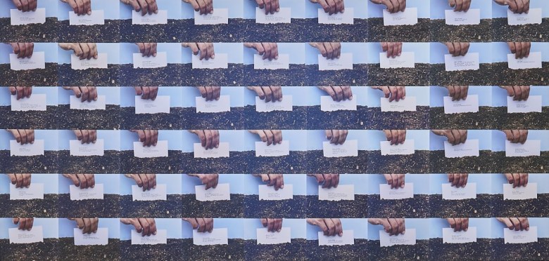 The history of humanity is riddled with stories of colonization and acts of violence toward Indigenous peoples. Landmines, curated by Sophie Landres at the Dorsky at SUNY New Paltz in New Paltz, presents the work of four artists whose camera-based work explores the role of landscapes as revealers or concealers of narratives. “Cabins and Shadows” (2019) by Dawoud Bey is a black and white photograph of a lonesome stretch of shadowed plantation yard, hinting at the horrors of slavery. Richard Mosse’s “Slaughterhouse, Rondônia” (2021) is an aerial drone’s view of this unforgiving location in the Amazon basin — and yet he turns this bleak place into an otherwise beautiful vision of psychedelic colors and shapes. Christina Fernandez’s “Untitled Farmworker (Photographic Collage)” (1989/1994/2020/2025) agitates for reform in its depiction of an anonymous hand repeatedly placing a white card with the name of someone who has died and their cause of death — usually, toxic farming chemicals — into the earth.