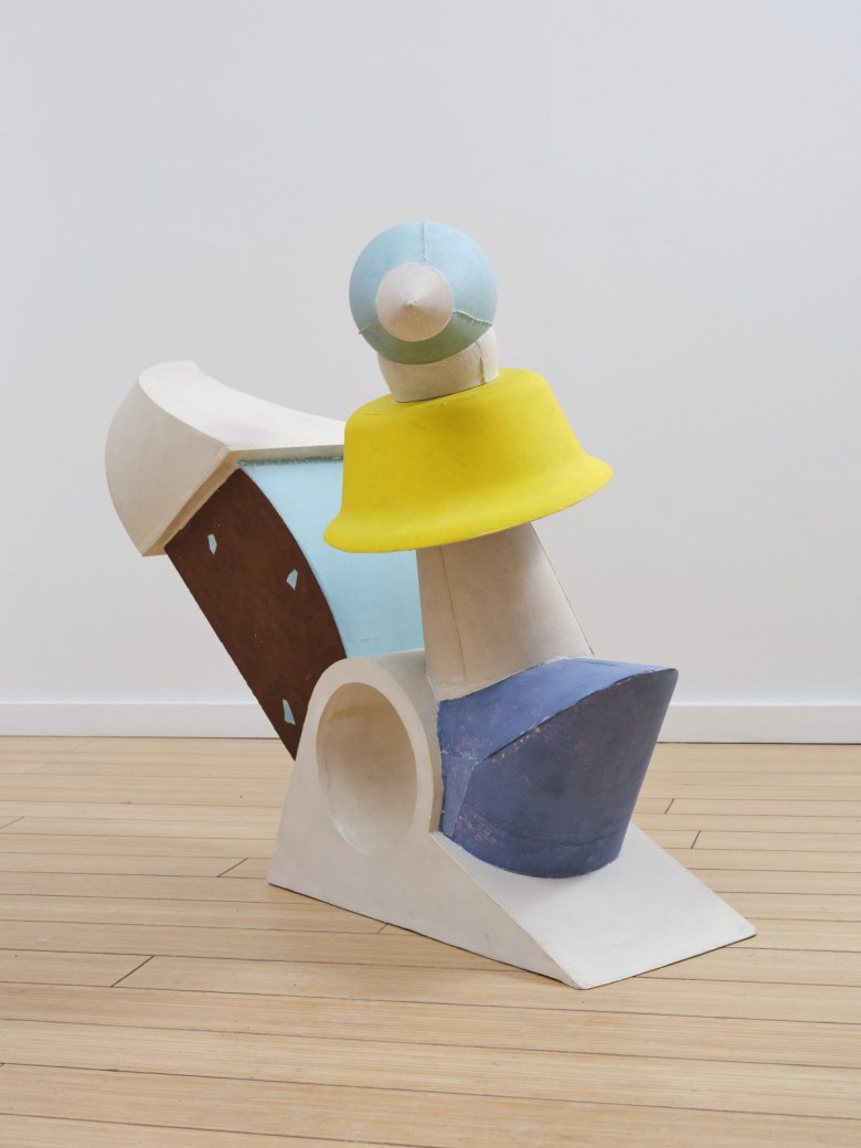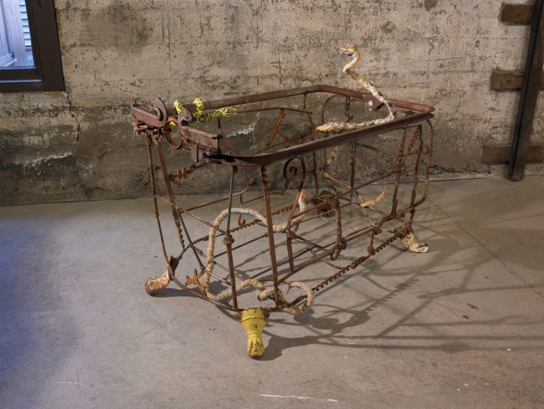 Z Behl is not afraid to go big. The first time I encountered the larger-than-life sculptures of this New York City-born-and-raised badass, I was smitten with her work. Pamela Salisbury Gallery in Hudson presents a four-story installation of recent multi-media works by the artist and her collaborator Kim Moloney (together known as BALONEY), including installation, paintings, drawings, and films. In “Artist as Coyote” (2025), Behl crafts a mythical half-human, half-animal out of cast concrete, metal, and stone; the shadows it casts are as compelling as its eccentric hunched anatomy. BALONEY’s “Harpy (3 Fates)” (2024), meanwhile, is a dynamic vision of another strange creature made from a wicker birdcage that appears on the verge of taking flight from a steel perch. And the duo’s “Fertility Tub” (2024) hints at an ulterior narrative with its surreal assemblage consisting of three snakes slithering around the empty metal frame of a tub. BALONEY’s “Portrait of the Artist as a Filmmaker” (2025) is the showstopper: Made of steel, concrete, and fabrics including lace, cheesecloth, and velvet, this elaborate harlequin character hangs down from the fourth floor and fills the open shaft of this historic carriage house with its monumental body, while Behl’s drawing “Plan for Carriage House” (2024) presents a sketch of this female trickster archetype balancing perfectly in a daring yogic position.