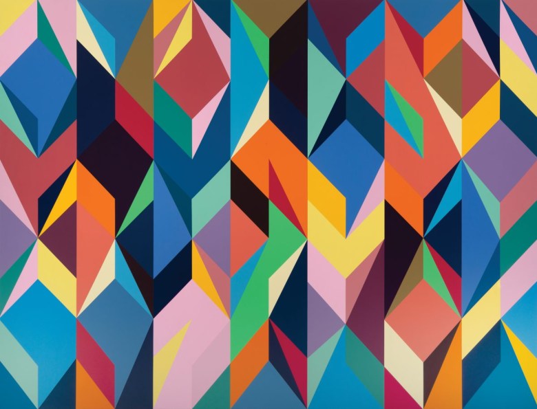 The Hyde Collection in Glens Falls presents a survey of Nigerian-American artist Odili Donald Odita, who employs a bright, bold graphic style that combines West African aesthetic traditions with a form of abstraction associated with Minimalism. Strong conceptual undercurrents such as violence and displacement (he fled from war in Nigeria as a child) highlight his personal journey to the States and infuse his work with fearlessness. For instance, in “Burning Cross” (2023), among the most provoking collage works in the show, an overlay of colorful shapes conquers images of KKK members in the background with their geometric beauty. The similarly sized and composed “Smoke” (2023) is a variation on this theme of overlapping realities. A series of early photographs reveal Odita’s interest in advertising and Black American fashion: works such as “The Authentic African (Businessman)” (1997) feature stylish lone figures free-floating against a white backdrop. Several large-scale abstract paintings anchor the show, including “Eternal” (2020) and “Return” (2024), both of which vibrate vigorously with Odita’s signature color palette. Where the highly angular “Light Storm” (2023) appears like a flash of intensity, “Descent” (2001), with its horizontal layers of cool colors, is a metaphorical exhale.