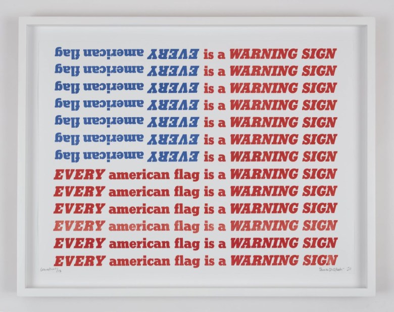 History Lessons at the University Art Museum in Albany presents works by 15 artists working from the 1960s to the present, including deceased greats such as Louise Nevelson and powerhouse contemporary figures such as Glenn Ligon. This mixed-media exhibition considers counternarratives that reposition the past and promote activism and education as fundamental to the health of society today. “AIDS (Marcus Garvey)” (1991) by General Idea — the collective project of Canadian artists Jorge Zontal, AA Bronson, and Felix Partz — is a bold reconfiguration of Robert Indiana’s “LOVE” (first created in 1964) and a poignant reminder of the once-crippling epidemic that ravaged queer communities (and claimed the lives of Zontal and Partz). “my ancestors will not let me forget this” (2020) by Demian DinéYazhi’ is a powerful text-based vision of an American flag that reads “EVERY american [sic] flag is a WARNING SIGN,” which is all the more chilling during our current political climate. Jeffrey Gibson’s “SHE KNOWS OTHER WORLDS” (2019) is a gorgeous example of his signature blending of geometric compositions and patterned beadwork to create punchy graphic visuals. And Hock E Aye Vi Edgar Heap of Birds’s “Sweetheart Songs” (2017–18), consisting of 24 monoprints with white text against shades of crimson, brings a smile with saccharine statements such as “hold me tight in your arms dear” and “no matter where you are I love you.”