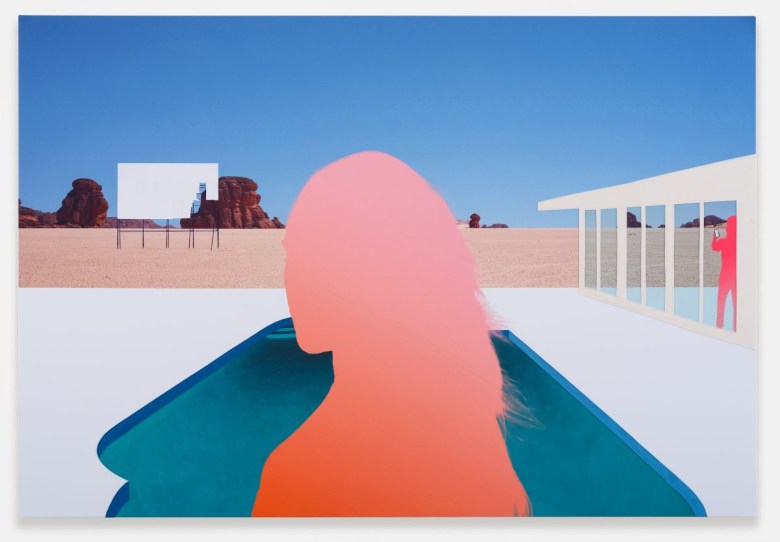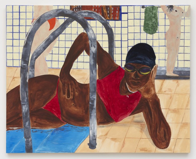 Marcus Leslie Singleton draws on his own life and personal experiences for the subject matter of his figurative paintings, which also offer insights into larger societal and cultural themes around race, gender, and sexual orientation. His first major solo show in LA features informal, candid scenes of Black life painted with loose brushwork and flat areas of colors, recalling the work of Jacob Lawrence, whom he cites as an early influence. Singleton’s paintings, however, channel an intimate specificity that sparks our curiosity, inviting us to ponder the narrative behind images of two young men on horseback, a goggled swimmer striking an Odalisque pose poolside, and a reclining artist painting a portrait of a seated model, both of them nude.