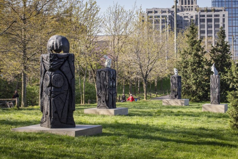 In Brooklyn Bridge Park, four massive bronze sculptures with organic material for heads (bones, horseshoe crabs) and plinth-like torsos rise from the earth atop cement blocks. These sculptures are sphinx-like in their awe-inspiring inscrutability, and recall Assyrian reliefs scored out of rough earth.