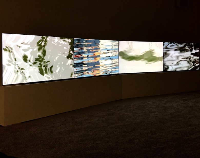In the artists’ immersive four-channel video installation, the surfaces of the Garonne River in France, the Bilbao Estuary, the Hudson River, and the Venice Lagoon ripple asynchronously to a musical score intended to evoke a sense of deep unease regarding humanity’s continued assault on our waterways.