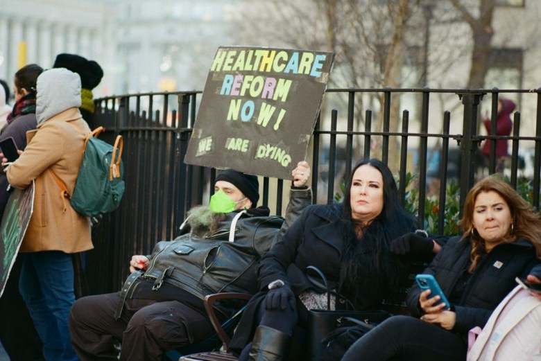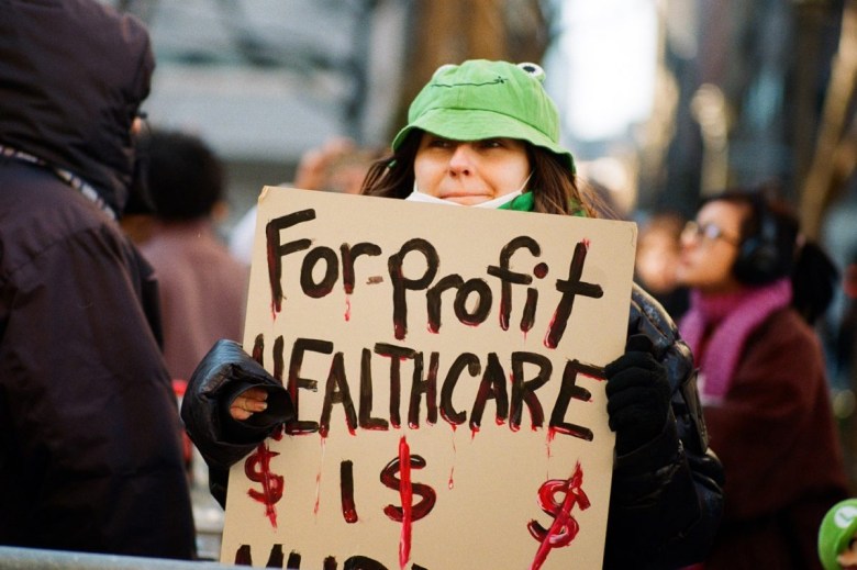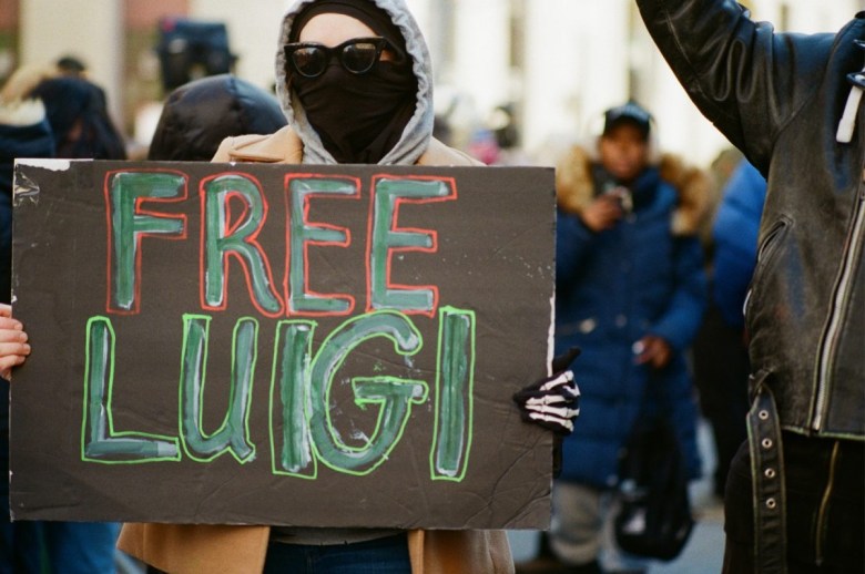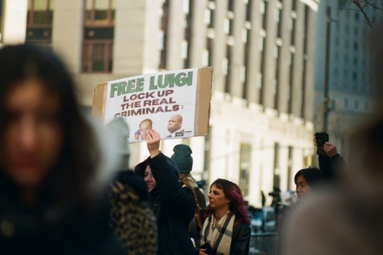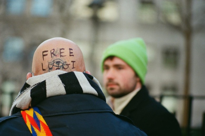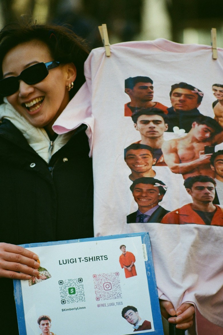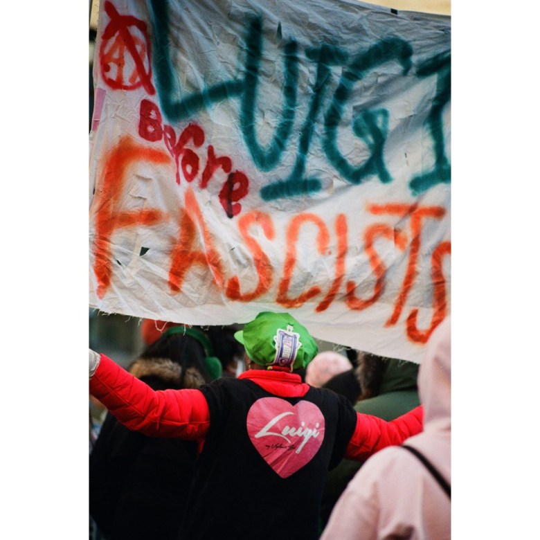 Lining the hallway, people sitting on the cold ground typed away on their computers. The olive-green floor stretched for what seemed like miles, and a strawberry-blond cop paced back and forth, ready to assert his dominance at the first opportunity. I hadn’t noticed the crowd gathered at the end of the marble hall: Luigi Mangione supporters, mainly women aged 18 to 35, some donning the accused UnitedHealthcare CEO shooter’s signature burgundy court sweater.