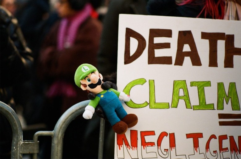 It’s 31 degrees outside, but the wind makes it feel like 19. When I arrived at the New York Supreme Court Criminal Term at 100 Centre Street around 10am last Friday, watercolor pencils and sketch paper in hand, there weren’t many people there except for a handful of journalists wielding cameras. I found this relatively sparse turnout strange until I overheard a woman say that they had started lining up at 5am and were already inside the courthouse. I hurried across the street, surprised at how quickly I got through security, camera in tow ready to take pictures of the scene I would find outside after the hearing — people hoisting hand-painted signs, prayer-style cards of “Saint Luigi,” and bright-green plushies of Mario’s twin brother in the Nintendo franchise.