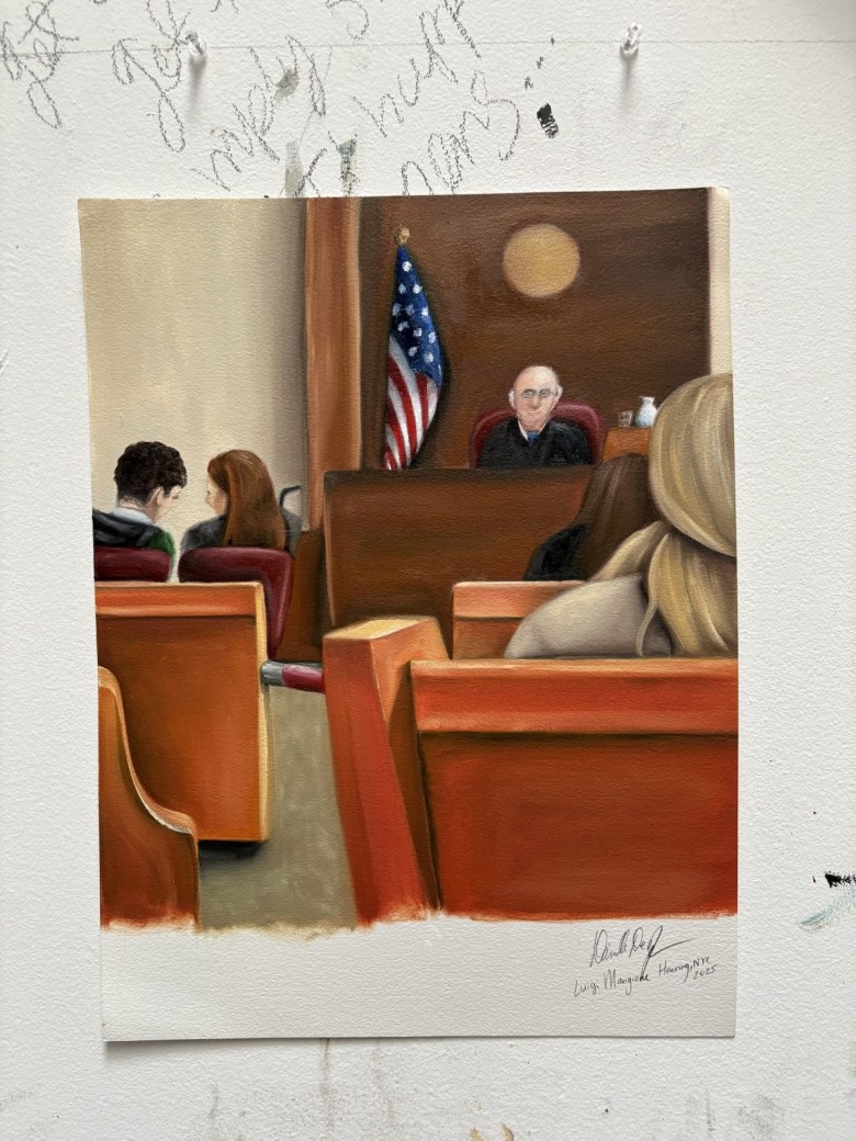 A towering female cop obscures my view, leaving me with just a glimpse of Luigi’s shoulder and a sliver of the bulletproof vest he was sporting. I scribbled lines across sheets of paper, trying to find my composition. Luigi’s lawyer asks for them to remove the shackles, arguing that her client poses no threat, but the judge denies the request “for the safety of those in the room.” Karen Agnifilo is like a bull. When it’s her turn to speak, she seizes the opportunity to express her frustration at a new HBO documentary, Who is Luigi Mangione, which she claims contains information she still had not accessed herself. “They paid actors to read his alleged journal. They didn’t even sound like him,” she argued. The judge stopped her before she could go any further.