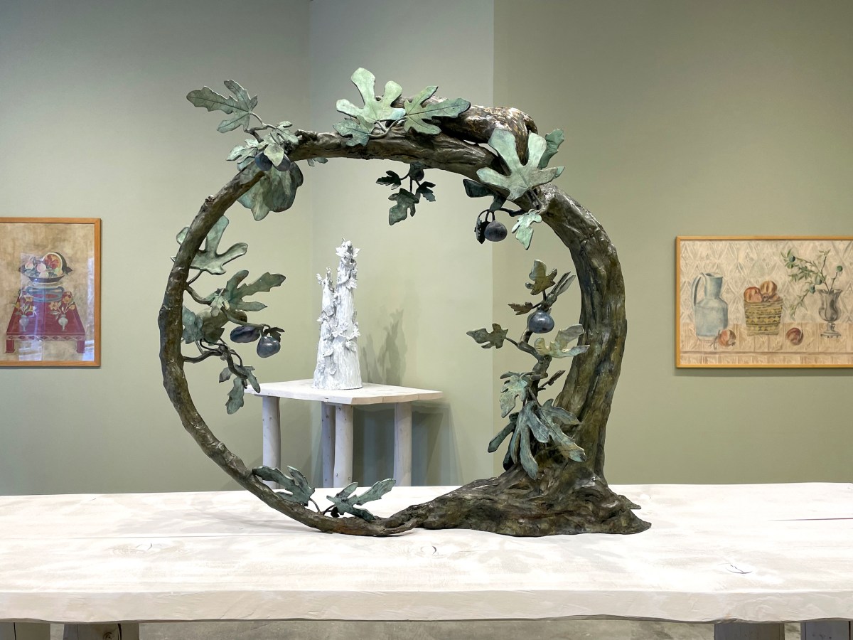 The artist’s felines, sculpted in ghostly white enamel-glazed clay, infuse the space with a quiet vitality, bridging the mystical and the everyday.