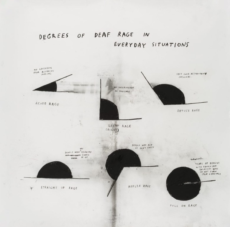 But Kim also deals in the limits and failures of such systems. In “Competing Languages I” (2020), two bent musical notes-as-staffs are stacked atop and facing away from each other, with the titular words nested on opposite sides, irreconcilable. She also draws attention to the exhaustion of communicating with hearing people in a world we constructed (“she is relentlessly… dedicated to sharing her Deaf lived experience with others,” the exhibition text says). In “Degrees of Deaf Rage Within Educational Settings” (2018), she points to the Kafkaesque condition of not being able to enroll in a class because it’s not popular enough among Deaf students for the school to employ an interpreter. In “Degrees of My Deaf Rage in the Art World” (2018), she calls out the art world — with “Guggenheim accessibility manager” being a particular source of rage.