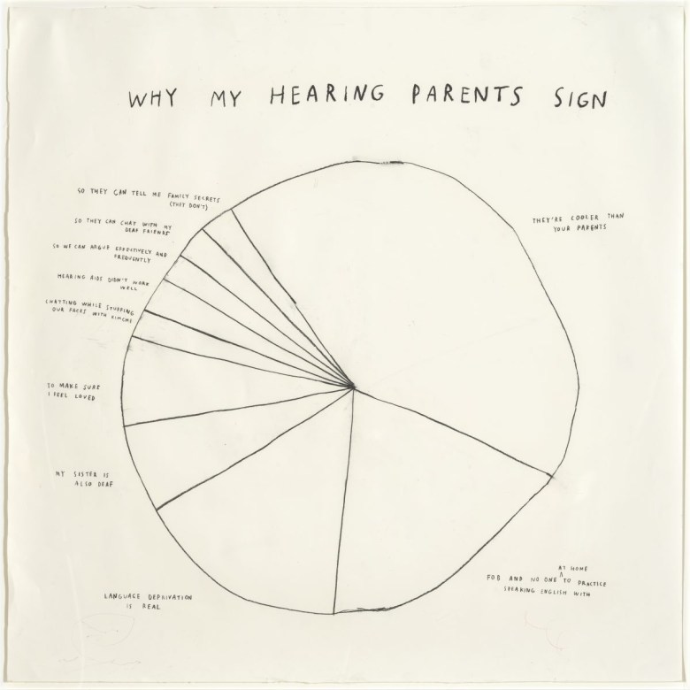 Kim is particularly adept at the often disregarded communicative registers of humor and gossip. In the series Degrees of Deaf Rage (2018), for instance, she uses diagrams of mathematical angles to represent the feelings induced by various situations, punning on the words “right” and “reflex,” which describe both a type of angle and a kind of reaction. It’s the kind of rubric that is simple, flexible, relatable, and iterable, like a meme template or a slang term. Case in point: a visitor immediately picked up on it, telling her friend, “My obtuse rage would be traffic.” It helps that Kim is hilarious. I laughed aloud at the “locally sourced rock” listed in the medium line of the “ATTENTION” label, and in the pie chart “Why My Hearing Parents Sign” (2019), one of the wedges reads “SO THEY CAN TELL ME FAMILY SECRETS (THEY DON’T).”
