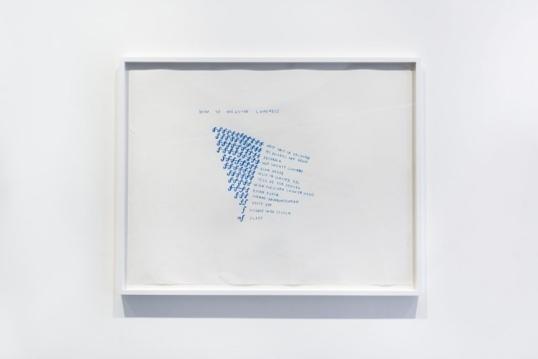 Kim revels in translation not just between languages or systems of notation, but between concepts and feelings or experiences in works such as “How to Measure Loudness” and “How to Measure Quietness” (both 2014). In the former, she ranks “ASIAN FLUSH” above “SUBWAY ANNOUNCEMENT” but below “YELL AT TSA OFFICER,” suggesting a volume to physical discomfort. The latter work compares volume to psychological discomfort: She uses the musical notation “p,” denoting softness, to notate the silent treatment as “pppppppp” — the silence, one could say, is loud.