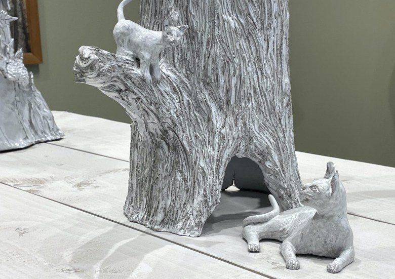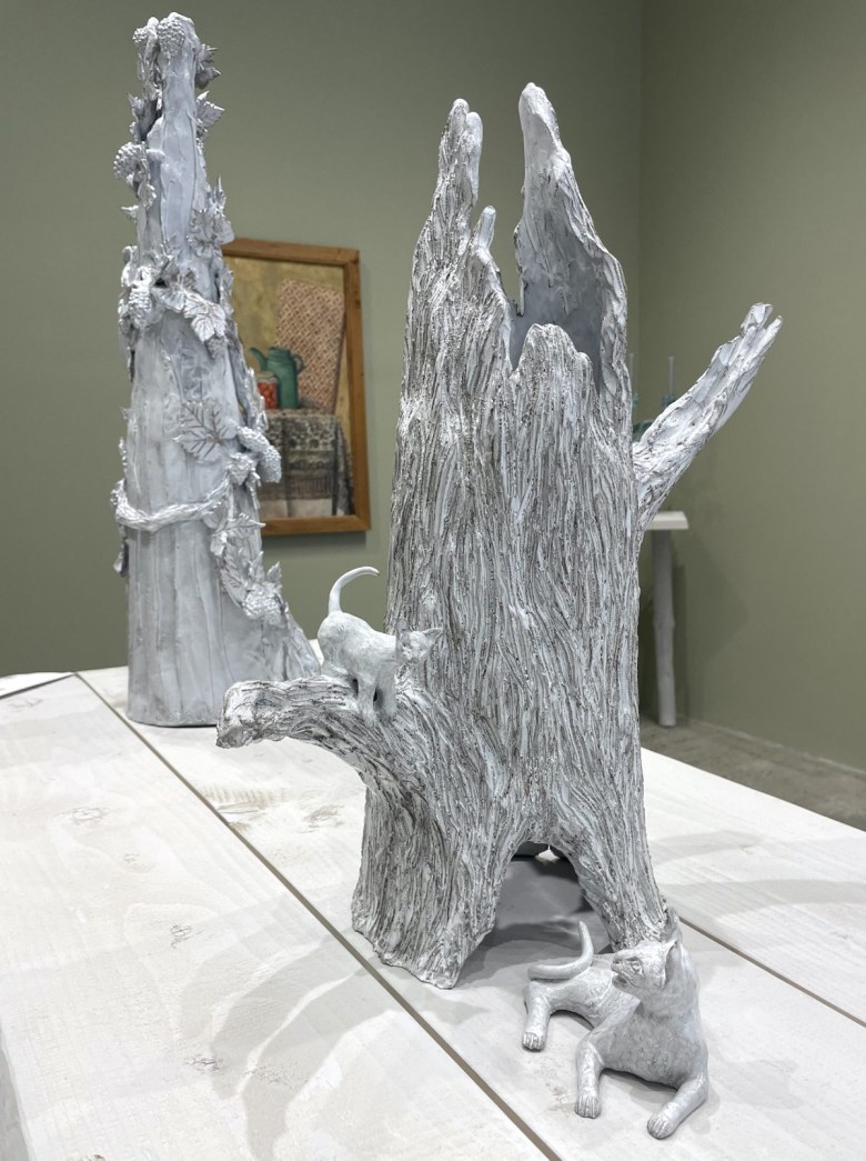 Kingdom of Cats at Gagosian’s small uptown outpost on Park Avenue transports visitors into a serene, timeless realm where nature, craft, and culture merge. Gnarled, winding trees teem with surprises: snakes slither around their trunks, fruits dangle, and cats appear as playful presences. These felines — perched among trees, standing tall as independent ceramic figures, or depicted in the paintings on the walls — infuse the space with a quiet vitality, bridging the mystical and the everyday.