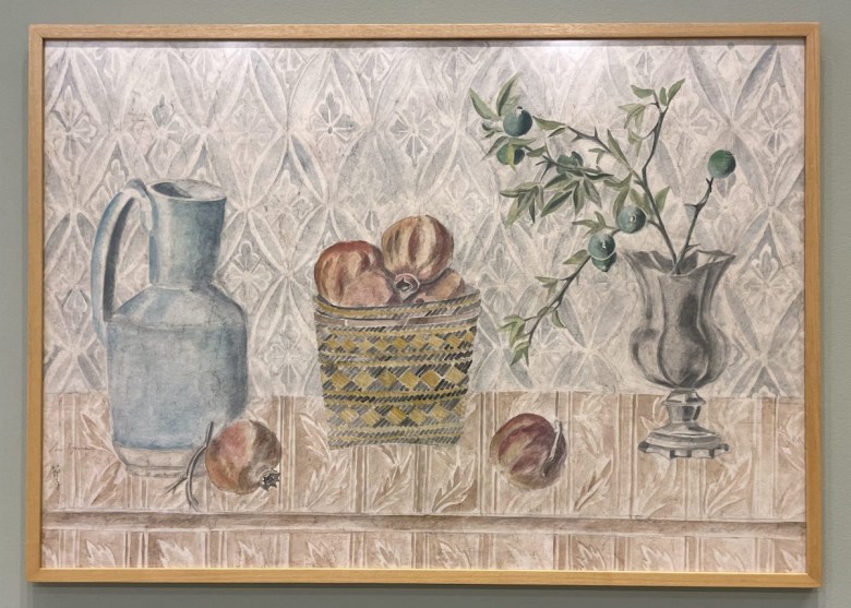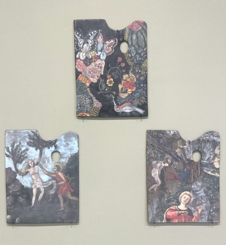 Setsuko’s approach to sculpture is deeply tied to materiality, balancing fragility and endurance through her distinctive techniques. She often works with dark terracotta, layering it with white enamel glazes to create a luminous, almost ethereal surface — heightening the interplay between surface and depth, rawness and refinement, and the contrast between permanence and transience, which extends to her bronze works incorporating imagery from nature. Her paintings of still lifes and fantasy scenes, which hold equal weight in the exhibition, reflect the hushed tonalities of Morandi, the bold clarity of Matisse, and the distilled elegance of Japanese woodblock prints, and echo the quiet resonance of her sculptures. Some are done directly onto paint palettes, including an imaginative portrait of a woman composed of flowers and butterflies.